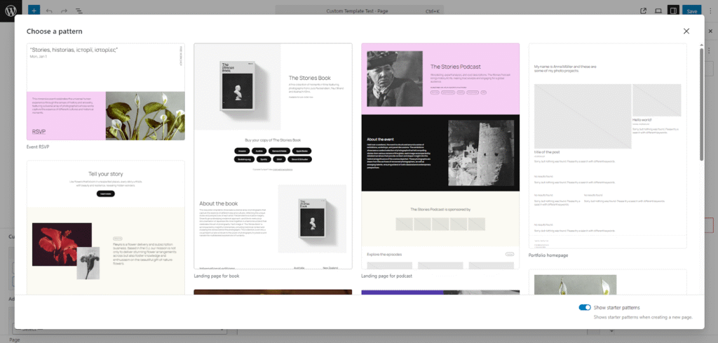 If you do that, your pattern will be displayed in this modal every time a user creates a post of the selected post type(s). Besides starter page patterns, there are also starter template patterns. They work exactly like page patterns, but they are suggested when the user creates a template in the Site Editor (e.g., a single post, an archive, or a front page template).