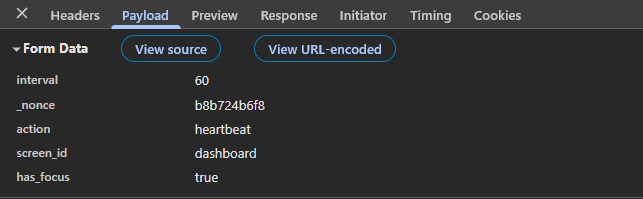 Here comes the “deep dive”. On the frontend, this API is just a heartbeat.js file. It is only enqueued in /wp-admin/ by default (not on the frontend). Here’s what a typical payload looks like (as I already said, the endpoint is /wp-admin/admin-ajax.php):
