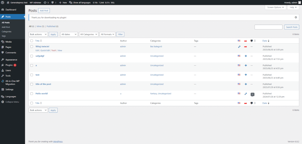 And here is what the “Posts” menu looks like with Polylang. Notice the buttons to add/edit versions for each active language: